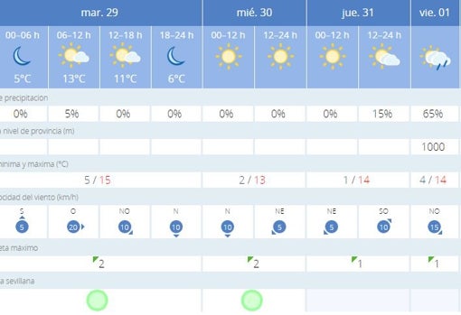 La capital registra hoy 344 litros de lluvia de los 51 totales del mes de enero Aemet predice una alta probabilidad de lluvias hasta el sbado por la tarde-noche F. Pronstico meteorolgico con datos de temperatura humedad velocidad y direccin del viento estado del cielo presin atmosfrica probabilidad de lluvia etc. Previsin del tiempo y temperaturas para hoy maana y los prximos 14 das en Sevilla.